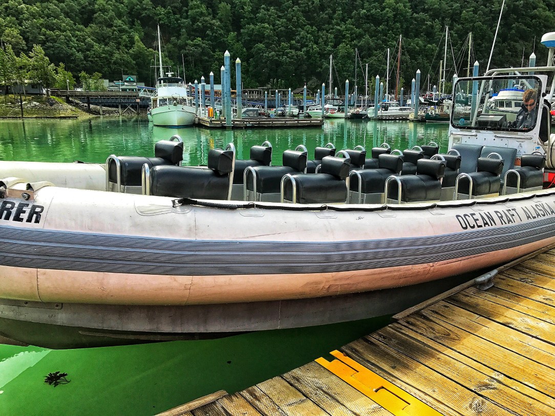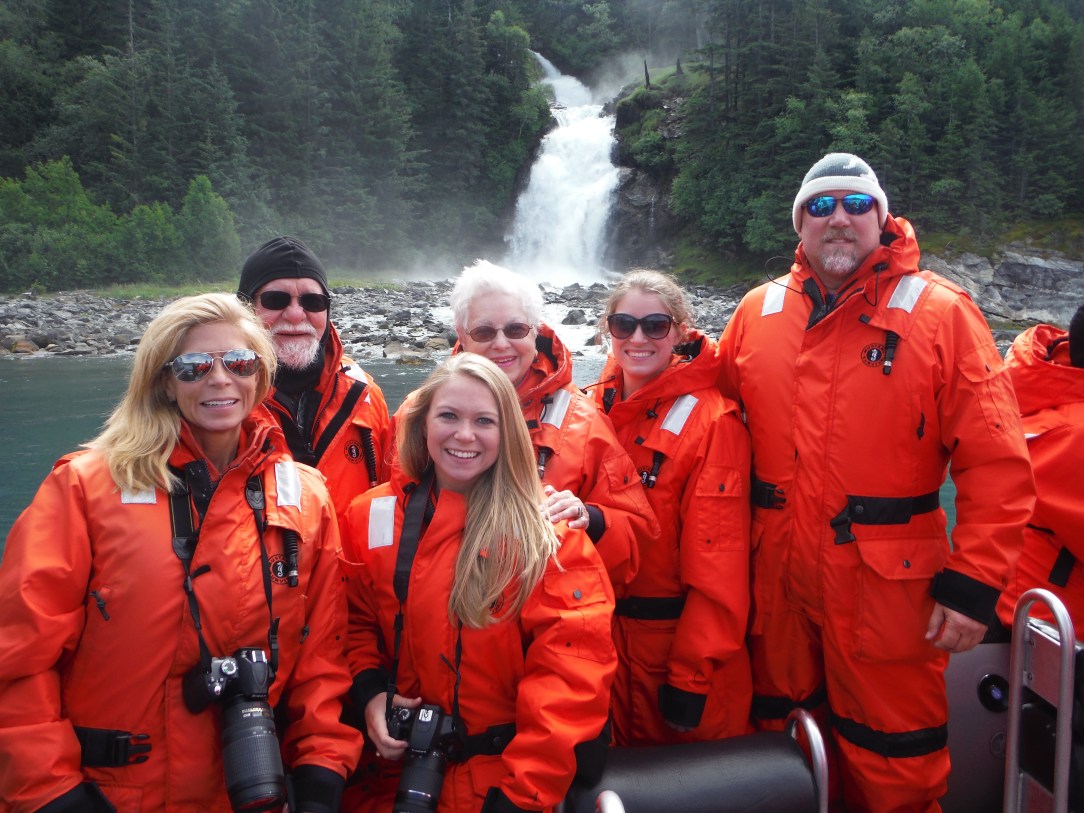 My aunt, uncle, and cousins went ziplining. The rest of us went on a raft tour. We take a five minute bus ride to a different area of the port for smaller water crafts. Before we actually get on the raft they have us put on these bright orange coverall type things that are actually flotation devices. We decided that those suits should be standard issue in Alaska for tourist because they kept us warm and dry. The rafts themselves are similar to those lightweight motorized watercraft that you would use to get to shore from a larger boat. But these have been set up for tourists and have seats that you sit on like you would a saddle.