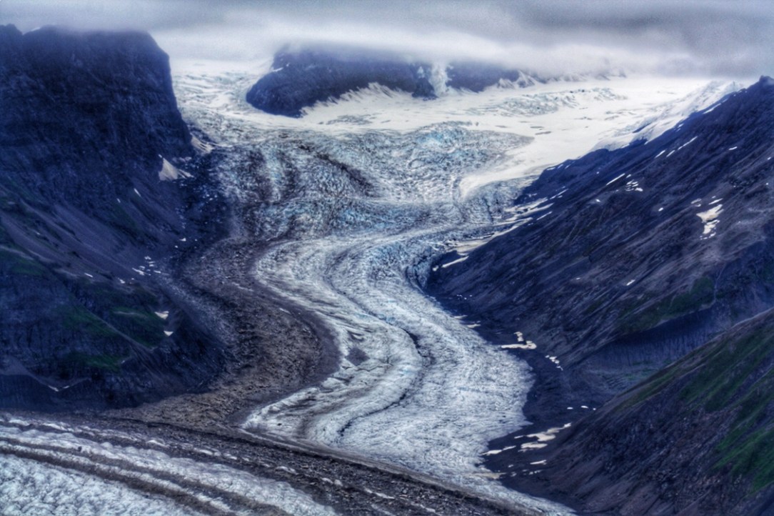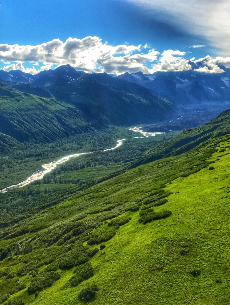 That flight, that hour, was one of the most breath taking adventures of my life. The pilot flew us over the mountains of the Alaska Range with its green and glacial valleys. I was in awe at the sheer majesty before me. Words and pictures can only do so much. Before the mountain range started there were forests and open fields with bright ponds and lakes while nearby ran a river, opaque with glacial silt. The foothills of the mountains opened up to bright green valleys and then we were in the middle of the range. Beneath us were giant rivers of ice.