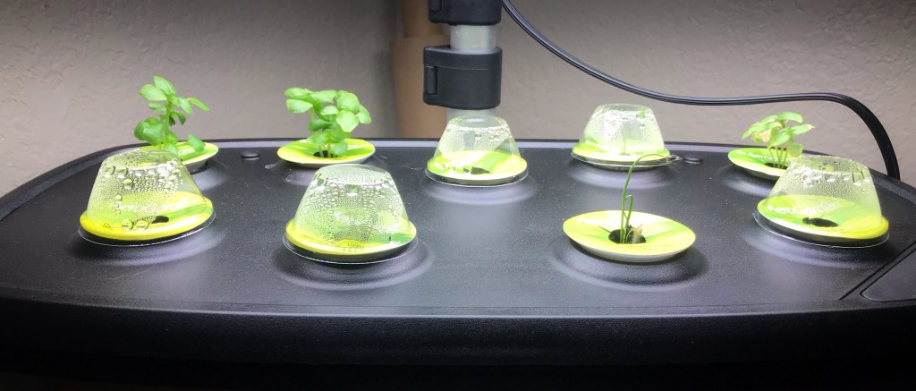 The set he got me came with 9 seed pods and food for them. Seriously this thing is great. All have to supply is water and power. Anyway I am currently growing: basil (2), Thai basil, thyme, dill, Italian parsley, curly parsley, mint, and chives.