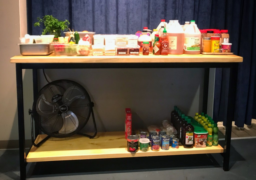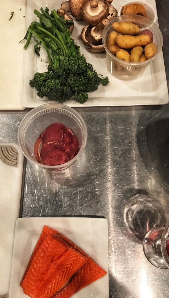 After a bit of socializing we were split into teams and had to create two dishes: one using pork loin and the other using trout (yes, I know it looks like salmon). Our dishes also had to contain all four mystery ingredient: fingerling potatoes, portobello mushrooms, broccolini, and peanut butter. To help complete the dish we were welcome to use anything in the pantry.