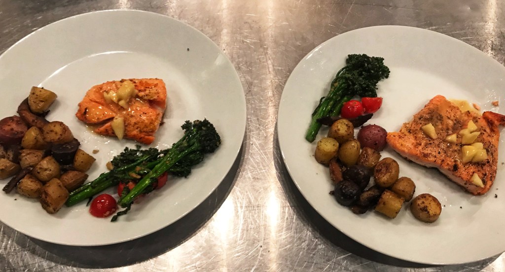 In the end we made an Asian inspired peanut-soy sauce with garlic and ginger for our pork loin on a bed of pureed potatoes with stuffed mushroom caps and sauteed broccolini. Our second dish was pan seared trout with lemon zest topped with a peanut-apple vinaigrette with roasted potatoes and mushrooms paired with sauteed broccolini. The team I was on had fun coming up with the proper descriptions for our dishes.