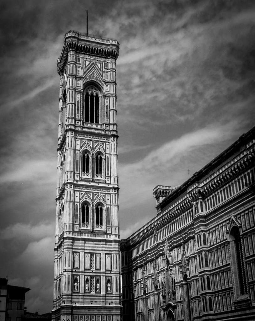 On my first or second morning in Florence my home-stay roommate and I climbed the Bell Tower next to Florence Cathedral (Duomo). The 414 steep steps tried to kill me. The view is worth it at the top. The structure is beautiful, white, red, and green marble. Building began in 1334 and was completed in 1359.