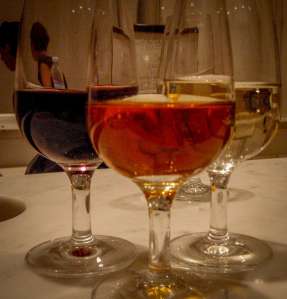 I don’t remember what all of these wine are but the middle one is a vin santo. It is a dessert wine and one of my least favorites but the color is beautiful.