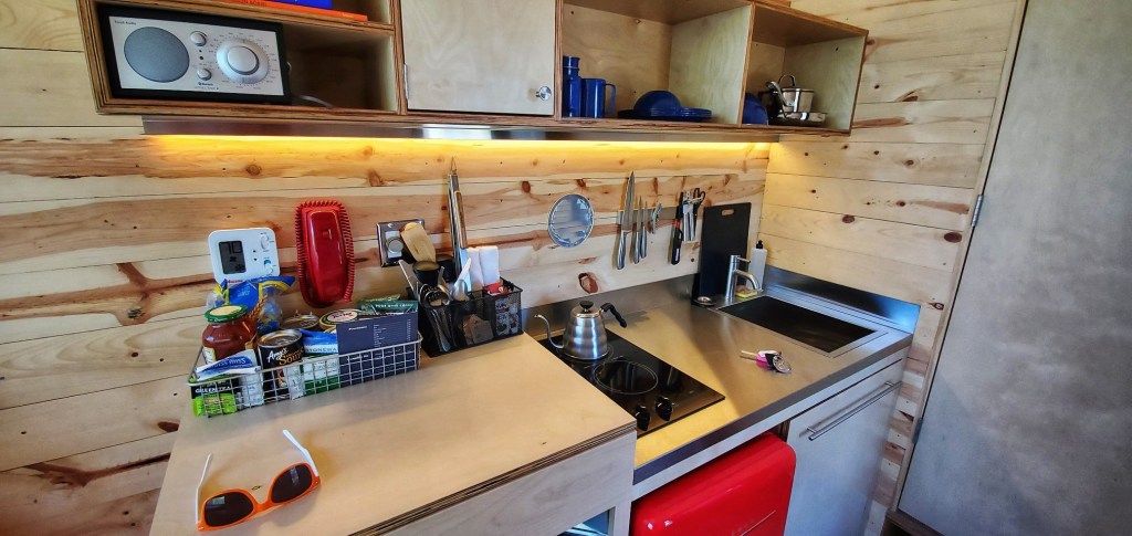 The kitchenette has everything you need to cook with from pots and pants to a kettle. There is a mini fridge and they do have some easy to make food available for purchase along with coffee. We brought most of our own food but took advantage of the pour over coffee they had available.