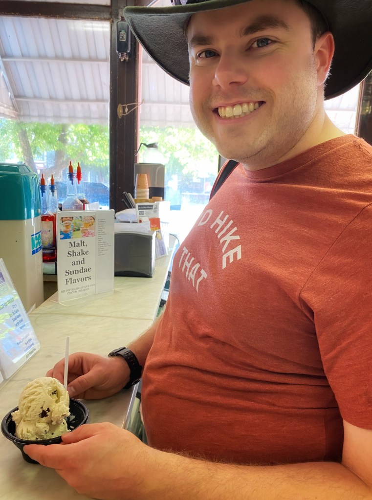 Keltin got the chocolate chip ice cream and a limeade. I ended up with the sweet almond ice cream and a cherry limeade. That ice cream was some of the best that I have had. We had a good time sitting under the awning outside of the shop. We met the volunteer from the motorcycle museum, he was out picking up dinner for himself and his sister.