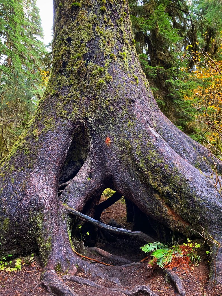 There is so much ground cover in the forests of Olympic National Park that seedlings do not have much of a chance if they land on the forest floor. There is little free soil and they are competing for resources. Many trees begin life on fallen trees that become know as nurse logs. The young trees use the nurse logs to gain an advantage over the other seedlings. The nurse log eventually rots away and these massive trees are left with a tunnel through their trunk and roots.