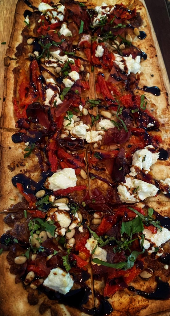- Black Ridge, California, Merlot – This was a nice red with hits of plum and cherry. It paired wonderfully with the peperoni and bacon flatbread drizzled with balsamic. According to the winery guide this merlot is good chilled and thus good for warm summer days.