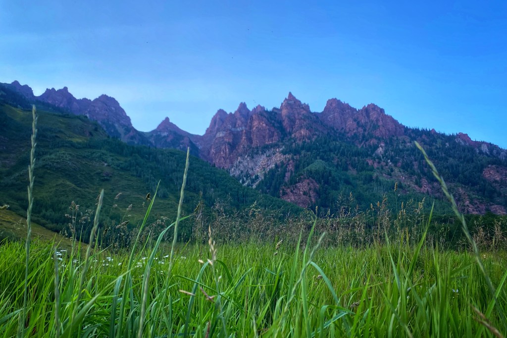 The Bells are in the White River National Forest. The area just looks magical. I’m a huge fan of fantasy and the aspen trees in the sunset and the tall green grasses rippling in the breeze and the field full of wild flowers looked like it was made for summer fey to dance upon. We did not have the area all to ourselves but having time slots keeps the the crowds to a reasonable amount. The main walking area is around Maroon Lake and there are trails past the lake. We did not get to hike them because they were closed for restoration.
