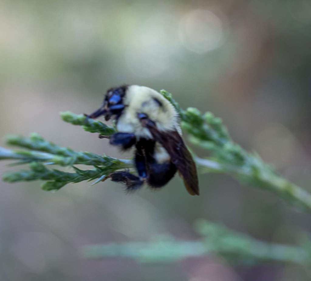 I learned a bit about bumblebees after this hike. I was wondering why this little one was hanging out in the grass all by itself. Male bumblebees do not return to the nest after leaving it and sometimes female bees get caught outside when the temperature drops too low. Both will sleep on plants and inside flowers! I found the little guy (or gal) on a long grass stem in the cool shade while on the way back to the car.