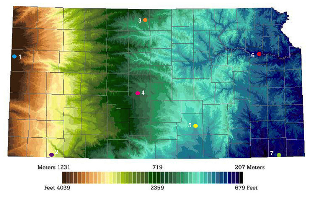 Western Kansas is now a vast plane. The few trees surround homesteads as wind breaks. The state may appear flatter than a pancake but it actually slowly rises in elevation as you move east to west. For comparison, Dallas is only 420 feet above sea level. The highest point in Kansas is Mount Sunflower at 4,039 feet above sea level (no. 1 on the map). A note on the lack of trees, any time any town or fort was abandoned or closed, the wood and other building supplies were repurposed because they were limited resources in the area.
