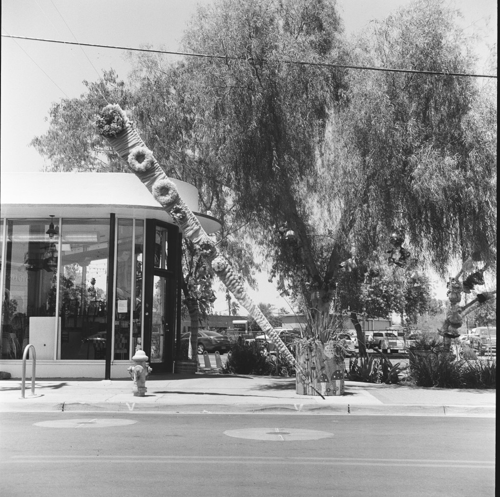 We also found some really neat street art. The coolest was probably the yarn bombing. Most of the time I love black and white photos but these trees are a riot of color. Thankfully I did get the color on video. This is somewhere on Grand Ave and if my research is correct this section of street has been decorated in yarn for a couple of years.