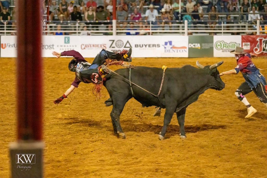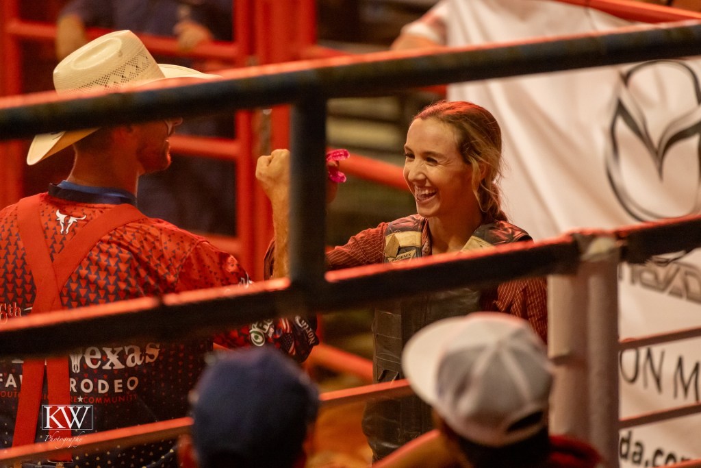 I also want to note that these women practice in the heat of the Texas summer for three months to prepare themselves and their horses for this event. There were a lot of impressive ladies at this rodeo, in one of the pictures below is a woman fist bumping the rodeo clown, she is a woman bull rider who road the heck out of her bull.
